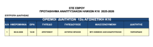 NEA • ΑΝΑΠΤΥΞΙΑΚΩΝ Κ12 • ΑΝΑΠΤΥΞΙΑΚΩΝ Κ14 • ΑΝΑΠΤΥΞΙΑΚΩΝ Κ16 • ΠΡΟΓΡΑΜΜΑΤΑ 2025-2026 ΕΠΑΝΑΠΡΟΓΡΑΜΜΑΤΙΣΜΟΣ ΑΓΩΝΩΝ ΠΡΩΤΑΘΛΗΜΑΤΩΝ ΑΝΑΠΤΥΞΙΑΚΩΝ ΗΛΙΚΙΩΝ Κ12, Κ14, Κ16 ΛΟΓΩ ΑΝΑΒΟΛΩΝ